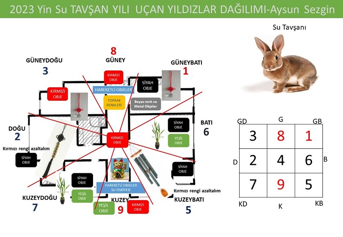 - Tavşan senesinde merkezdeki yıldız, ağaç elementi olan 4. Feng Shui de 4 Yıldızı Rüzgarı temsil eder. Bundan dolayı 2023’de rüzgâr ile alakalı doğa olayları sürpriz olmayacak. 4 aynı zamanda Aşk Çiçeği anlamına da gelir. Bu da eğlence, sinema moda gibi endüstrilere zenginlik getirmesinin yanı sıra romantizm ve sex skandalları anlamına gelir. Talihsizlik ve engelleri simgeleyen en tehlikeli yıldız olan