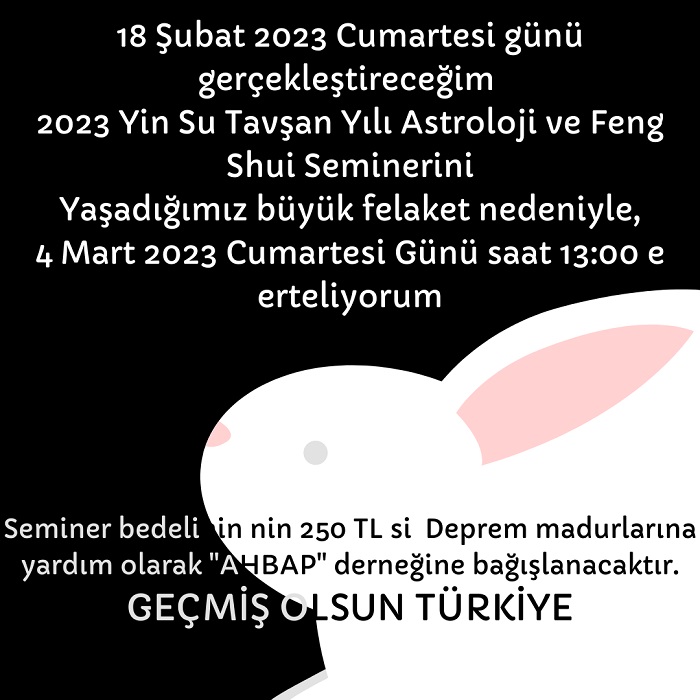 4 Şubat 2023′ de İstanbul’ a göre 01:05 de senenin ve ayın elementleri değişti ve güneş takvimine göre Tavşan yılına girdik. Tavşan yılı herkese hoşgörü, anlayış, iyimserlik, sağlık, şans ve bereket getirsin.